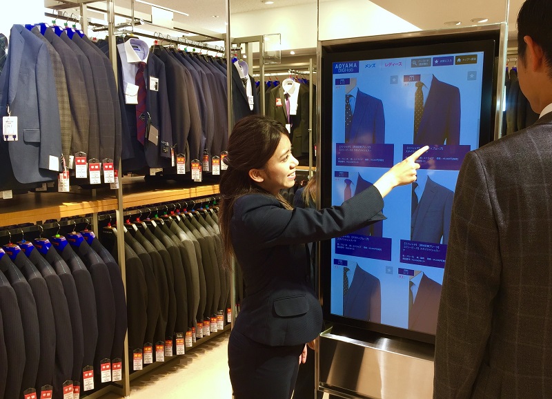 紳士服小売り大手の青山商事(本社・広島県福山市、青山理社長)でも、デジタルツールを駆使した実店舗と通販サイトの連携を行っている。9月15日に開設した「東急プラザ蒲田店」と同29日に開設する「島忠ホームズ仙川店」は、それぞれ都内の商業施設内の店舗で、同社が進めるネット融合型次世代店舗の「デジタル・ラボ」の形式となっている。両店舗は店内に大型のタッチパネル式サイネージやタブレット端末の「iPad」を設置しており、そこで通販サイトの在庫から商品選択ができるようになっている。購入商品は最短2日で配送される仕組み。店頭で試着・採寸して手ぶらで帰れるという利便性で訴求している。
