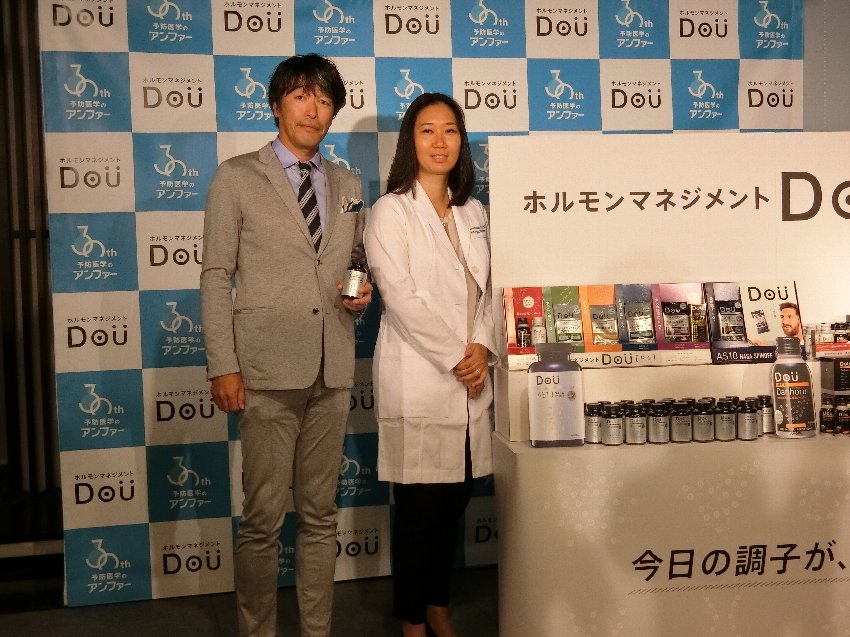 発売したのは「Dou(ドウ)」。ホルモンの状態を理解して対応するセルフメディケーションを「ホルモンマネジメント」として提唱する。医師や研究機関など専門チームと連携して開発し、身体や心、性の根本ケアを目的とするもの。9月20日の記者発表会で叶屋宏一専務(写真㊧)は「日本のホルモンケアの市場規模は2~3億円と小さい。商品を拡充し、カテゴリーリーダーを目指す」とあいさつした。