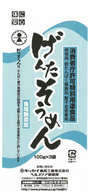 キッセイ薬品工業は、販売する特別用途食品「げんたそうめん」「げんたうどん」の表示が「優良誤認」にあたるとされた。「げんたそうめん」の違反期間は14年7月頃から昨年11月。容器に100グラムあたり「2・8グラム」というたんぱく質量と「病者用 低たんぱく食品 腎不全患者用」などと表示していた。だが、実際は期間内に製造した大半で「2・2~2・8グラム」とする規格値を0・1~0・4グラム上回っていた。