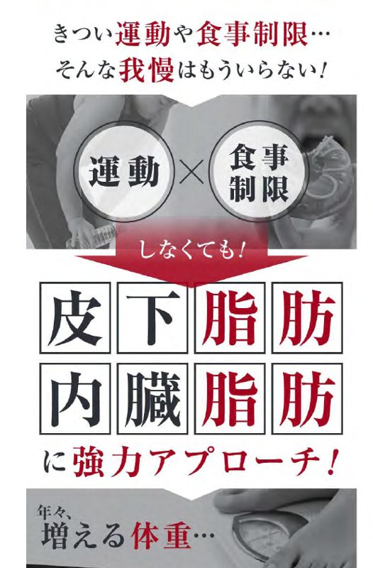 ただ、根拠として提出された試験データは、BMI25~30の人を対象にしており、運動(1日約8~9000歩)と食事制限で摂取エネルギーを消費エネルギーが上回る状態を維持することが条件。軽度の肥満を対象に得られた試験結果であり、イラストや表示からイメージされる極度の肥満の人を対象に「外見上、身体の変化を認識できる効果」とは認めず、届出表示を超えると判断した。試験からは体重で約1キロ、ウエストが約1センチ減少することが分かったが、通常の1日の変動範囲という。