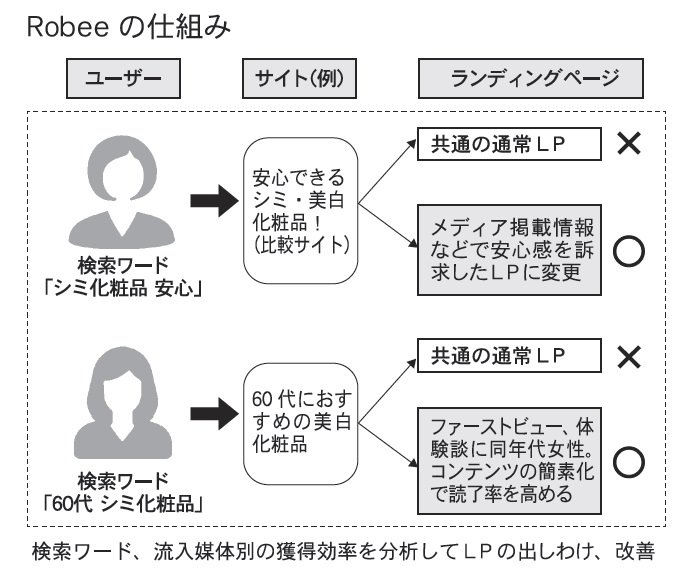 こうした中、まくびープラネットが11月から提供を始めた新ツールが「Robee(ロビー)」だ。アフィリエイターの掲載サイト一つひとつにフォーカスして獲得効率などを分析、これに応じてLPを改善できるもの。無数にある掲載サイトを管理し、改善できるツールは初めてとみられる。