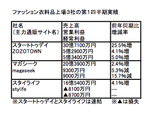 ファッション衣料品上場3社の第1四半期(4―6月)決算がこのほど出揃った。唯一、2桁増収となったスタートトゥデイだけが増益を達成。一方、マガシークとスタイライフはそれぞれ2.4%と4.1%の増収となるも、マガシークは減益、スタイライフは赤字となり、明暗が分かれた(表参照)。特にマガシークとスタイライフは主力事業としている売り場や媒体での苦戦が目立った。