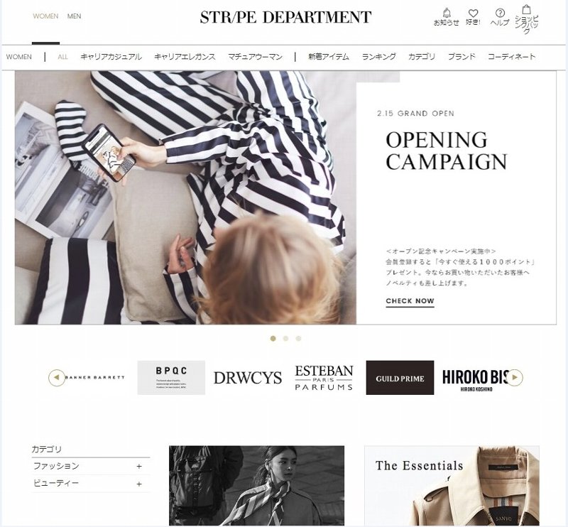 立ち上げたのは「ストライプデパートメント」。開始時点で約600ブランド・6万点以上の商品を取りそろえる。レディース8割、メンズが2割で、取扱商品のうちアパレルが6割で、雑貨が4割という構成。大人向けの高品質・高感度ブランドを集めたという。今後はブランド数を拡充し、年内に1000ブランド、2年目には1500、3年目には2000ブランドにする計画。