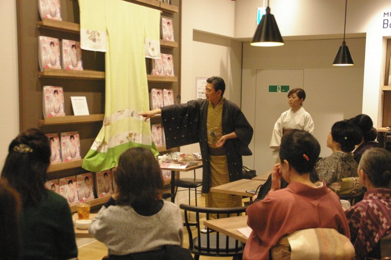 当該店ではミニ講座も開設して集客にもつなげているようで、着物を飾る企画に協力してくれた、絞り染め「京絞り寺田」の寺田豊氏を講師に招いて絞りの講座を2月23日に実施。着物の染色技法について学べる機会を作った(画像㊦))。