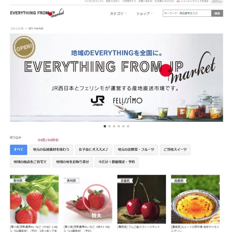フェリシモは2月26日、西日本旅客鉄道と共同で全国各地の産品を産地直送で販売する通販サイト「EVERYTHING FROM.JP market」を開設した。産直はネット販売ではおなじみのサービスであり、同様のサイトも多数ある。あえてこの時期に参入した狙いはどこにあるのか。