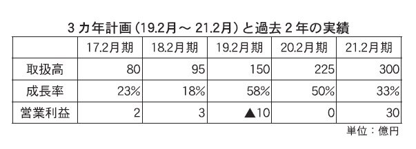 靴とファッションのネット販売を手がけるロコンドは、今期(2019年2月期)からスタートする中期経営計画を策定し、3年後の21年2月期に取扱高300億円、営業利益30億円の達成を目標に掲げた(図表参照)。