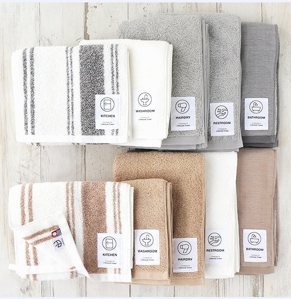 機能性が異なるタオルが一目で判別できるよう表面に「KITCHEN」や「BATHROOM」といったイラスト付きのアイコンタグを付けた。