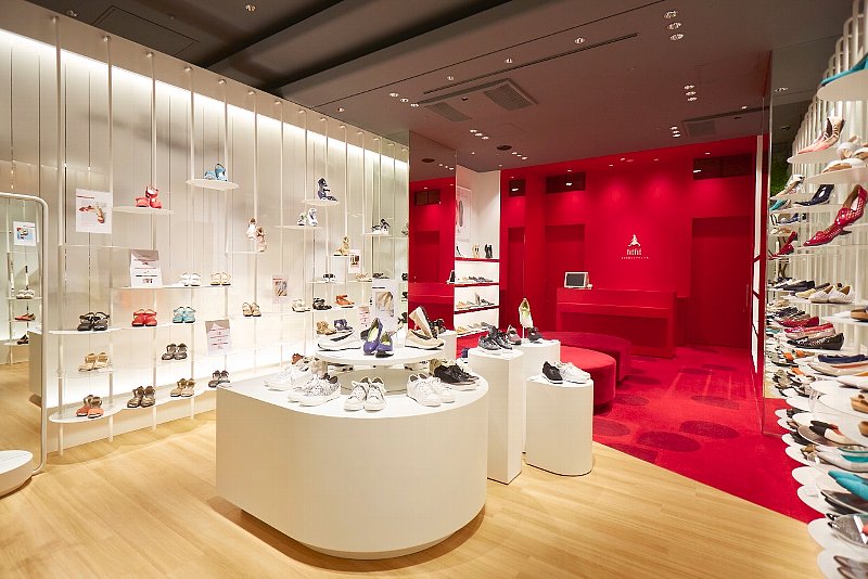 一方のフィットフィットも都内の既存店から精鋭を新店に集めて8人体制でスタート。次の成長に向けた店作りとして、婦人靴の売り場もドゥクラッセとの統一感を持たせつつ、ブランドカラーの赤が印象的な売り場とした。これまでもドゥクラッセと隣接した店舗展開はあるがグループで一体化した店舗は初めてで、靴に合わせた服や、服に合わせた靴も提案し、両ブランドで相互送客につなげる。