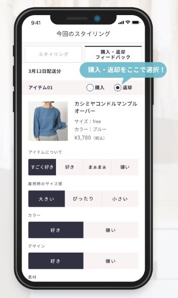 顧客は気に入った商品があればそのまま買い取り、気に入らなかった商品はまとめて返品できる仕組みだ。自宅でゆっくり試着をし、手持ちの服や靴とのコーディネートをチェックしながら商品を選べるため、失敗のない購買体験ができるとしている。代金は購入アイテム分のみで、スタイリング料と送料は無料となる。