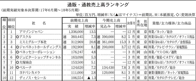 第70回通販・通教売上高ランキング<上位300社・本紙調査> 3年で7兆円台到達、9.3%増と高い伸び率