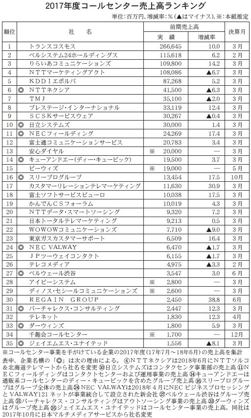 35社の中から、上位や通販系コールセンターなど注目企業の状況を見ていく。