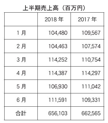 日本通信販売協会(JADMA)の売上高月次調査集計によると、主要会員企業約130社の2018年上半期(1~6月)の総売上高は前年同期比1・0%減の6561億300万円だった(表参照)。「文具・事務用品」や「雑貨」全体などが増加したものの、「衣料品」や「食料品」「通信教育・サービス」などが減少したこともあって前年を下回った。