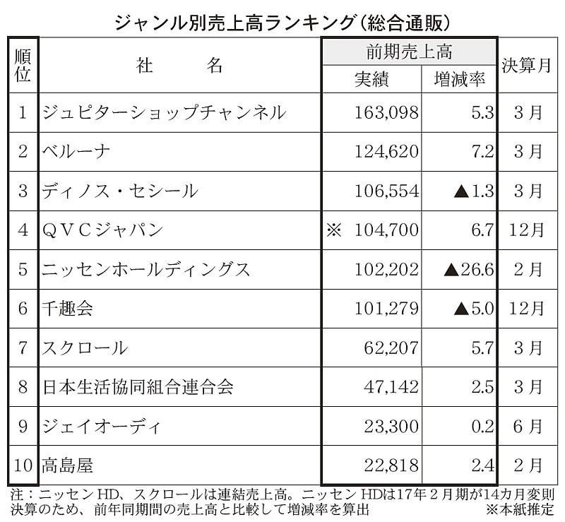 通販新聞社は7月、「第70回通販・通教売上高ランキング調査」を実施し、売上上位300社の売上高ランキングを発表した(第1664号参照)。同時に健康食品、化粧品、衣料品、食品といった通販の主力商材別の売上高調査も行った。今回は市場規模が大きく、また今後の市場の行方などが注視される「総合通販」「家電」「家具」「メーカー通販」を展開する上位の通販実施企業の直近の売上高を抜粋したランキング表を掲載しつつ、それぞれの市場の動向と各プレイヤーの状況を見ていく。