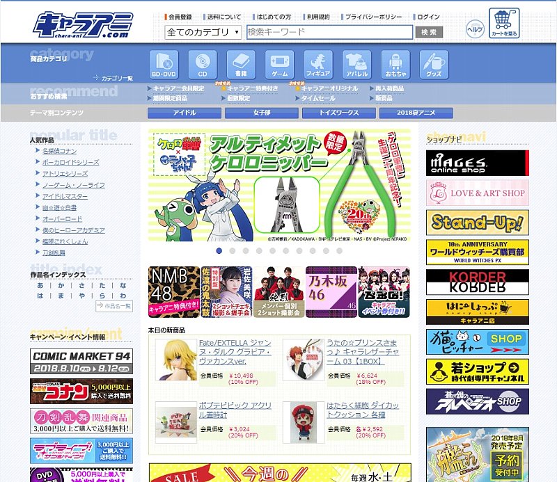 同社の2018年3月期の通販売上高は前年比約5%増の83億3600万円。売り上げをけん引したのはテレビアニメ「名探偵コナン」のグッズ販売で、1万円を超えるようなスケールフィギュアや特典付き商品などが20~30代の女性を中心に好調だった。サイト内での送料無料企画とアニメの映画公開のタイミングが重なったこともあり、例年にはない売り上げを記録。加えて、昨年からは通販サイト内でショップインショップのような形で人気コンテンツごとにページを作り込んで展開したこともあって、外部からの顧客を集客することもできたようだ。