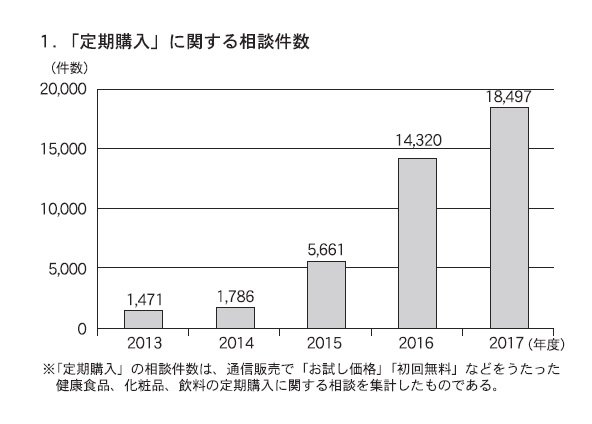 「化粧品」は1万5957件で、同3400件増えた。「健康食品」は3万181件で、同700件増えた。「お試し価格」「初回無料」などをうたったウェブ広告を見て、定期購入契約を結んだとするトラブルが増えた。