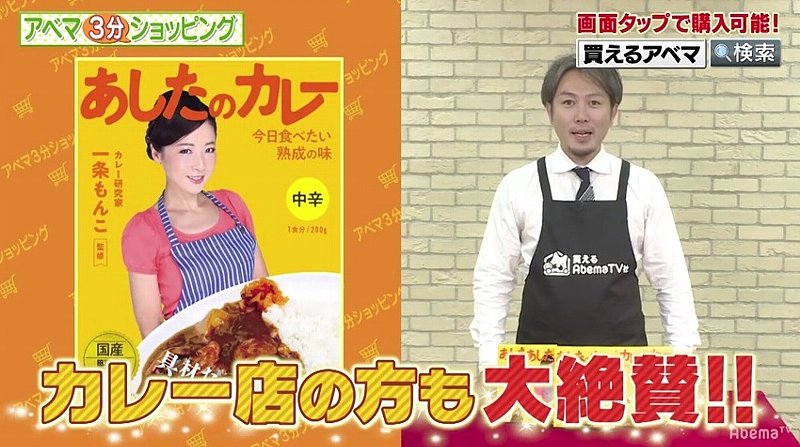 配信を開始したインフォマーシャル「アベマ3分ショッピング」は一般的なテレビショッピングと同様、商品の特徴などを体験者の声などを踏まえながら紹介していくスタイルの3分弱の短尺番組(画像)となる。まずは3月に1時間の通販番組で販売し、個数ベースでは過去販売商品の中で首位の売れ行きとなったカレー研究家でカレーのマニアでもある一条もんこ氏が家庭で作った"次の日のカレー"をコンセプトにした独自レシピをもとに10年費やし開発したオリジナルのレトルトカレー「あしたのカレー」と同じく以前に通販番組で紹介して売れ行きのよかった5秒で爪がピカピカになるという爪磨き「5 seconds shine(ファイブセカンズシャイン)」を訴求する2本のインフォマーシャルを制作した。