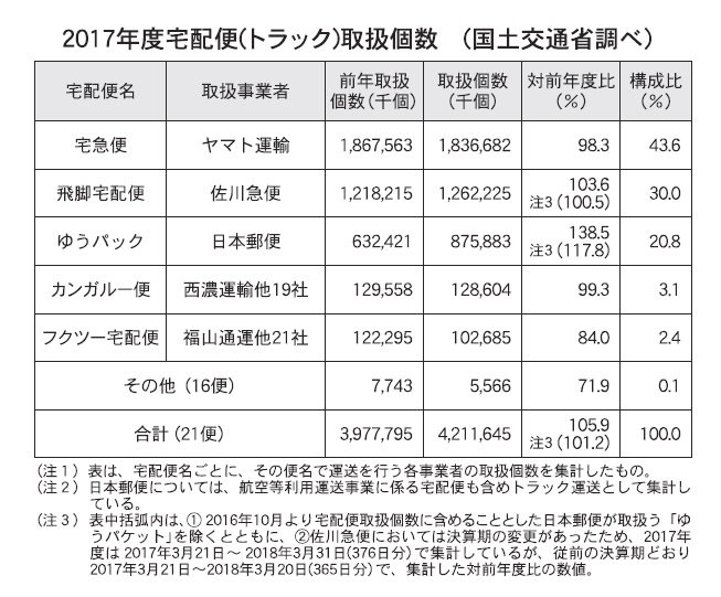 そのほかでは、西濃運輸などの「カンガルー便」が同0・7%減の1億2860万4000個、福山通運などの「フクツー宅配便」が同16・0%減の1億268万5000個となり、それぞれ3・1%、2・4%の構成比となっている。