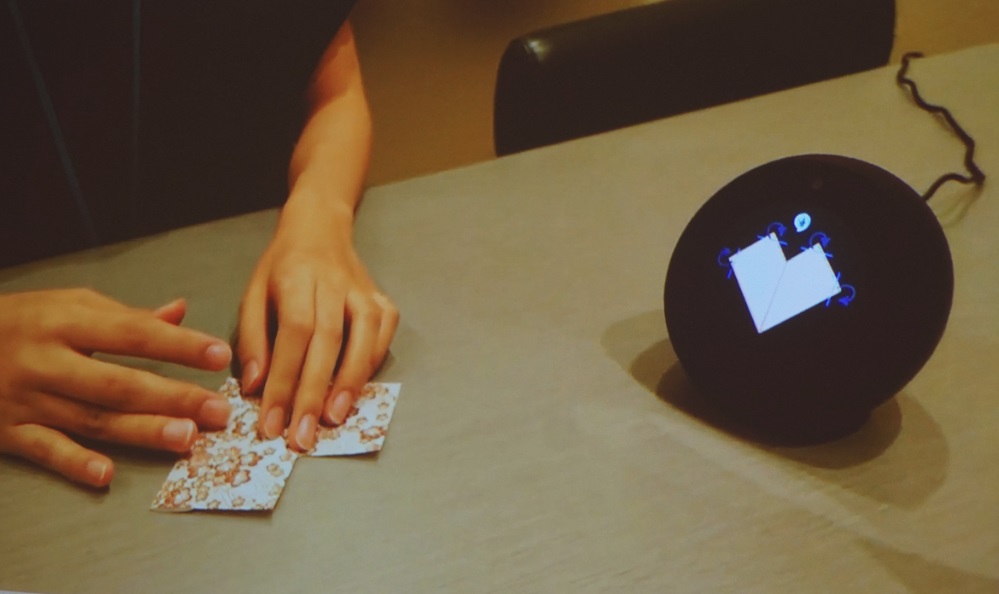 「みんなのおりがみ」は音声および画面付きの「エコー」の場合は、「折り図」を表示しながら、折り紙の手順を進めるたびに「できたかな?」と確認しながら折り方を教えるスキル(写真㊥)で現状、「ハート」など5種類の折り紙に対応している。手順を進める際に「ちょっと待って」と返事をすると次のステップにいかずに待ってくれるなどアレクサと利用者の間でインタラクティブに会話ができ、画像だけではわかりづらいこともある折り紙を音声の説明でうまく補完している点や折り紙以外のアイデアへの発展性などが評価され、最優秀賞に選ばれた。なお、部門賞の「キッズ賞」も同時受賞した。