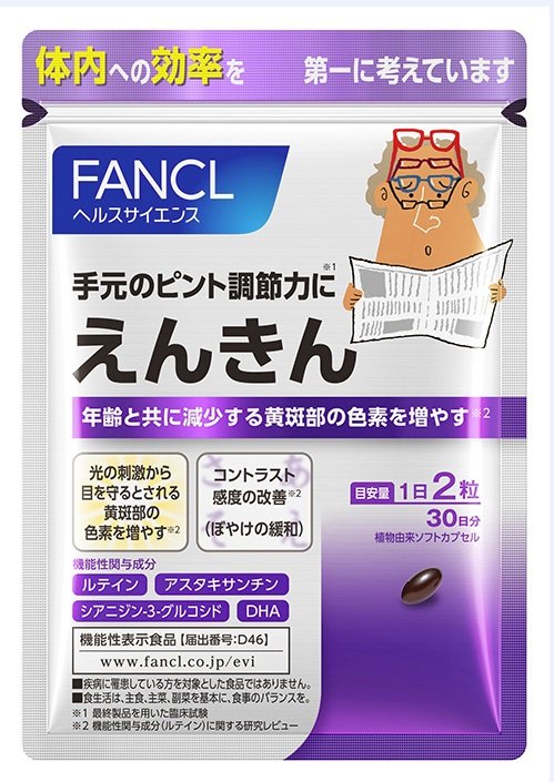「えんきん」(=画像、60粒30日分、税込2160円)は、従来から配合している機能性関与成分「ルテイン」の研究レビューを新たに行い、「ぼやけを緩和し、はっきりと見る力を助ける」「光の刺激から目を守るとされる黄斑部の色素を増やす」といった機能性表示を追加した。