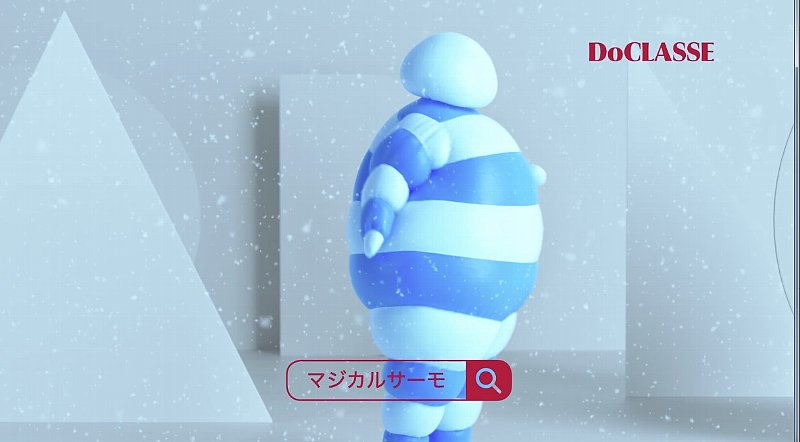 15秒と30秒の尺の中で、"スリムで軽くて暖かい"という「マジカルサーモコート」の特徴を効果的に打ち出すためにもインパクトを重視。米映像コンテンツ制作会社のメソッドスタジオNYとタッグを組み、最先端のビジュアルエフェクトの技術を駆使したCGキャラクター(画像(上))と、印象に残る激しいダンス、「ドゥ・ドゥ・ドゥクラッセ」という音楽の3つの要素でCMの世界観を構築した。また、CMにはドゥクラッセの通販カタログでもモデルとして活躍するRINAさんを起用。羽毛やダウンジャケットを模して丸々したCGキャラクターに変身して踊り、最後は同キャラクターがはじけて、「ダウンにさよなら」「スリムであったかい」の文字と一緒にRINAさんが「マジカルサーモコート」を着用して登場(画像(下))。「ダウンは暖かいけど太って見える」という女性の悩みを解消できるコートとして訴求している。