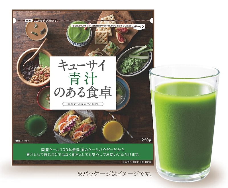 展開するのは、「キューサイ青汁のある食卓」(=画像、250グラム、価格は非開示)。国産のケールのみを粉末化したもので、水(2・5グラムを150ミリリットル)に希釈して飲んだ場合、約100杯分に相当する。