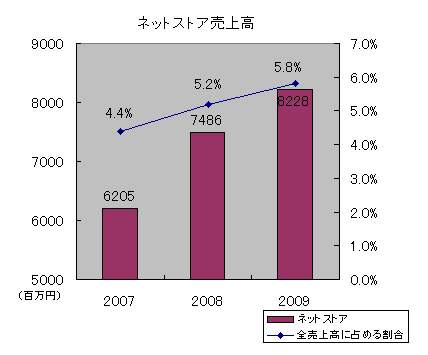 同社の2010年2月期のネット販売売上高は、前期比9・9%増の82億2800万円。全事業(売上高1643億4100万円)に占める構成比は同0・6ポイント増の5・8%となった。