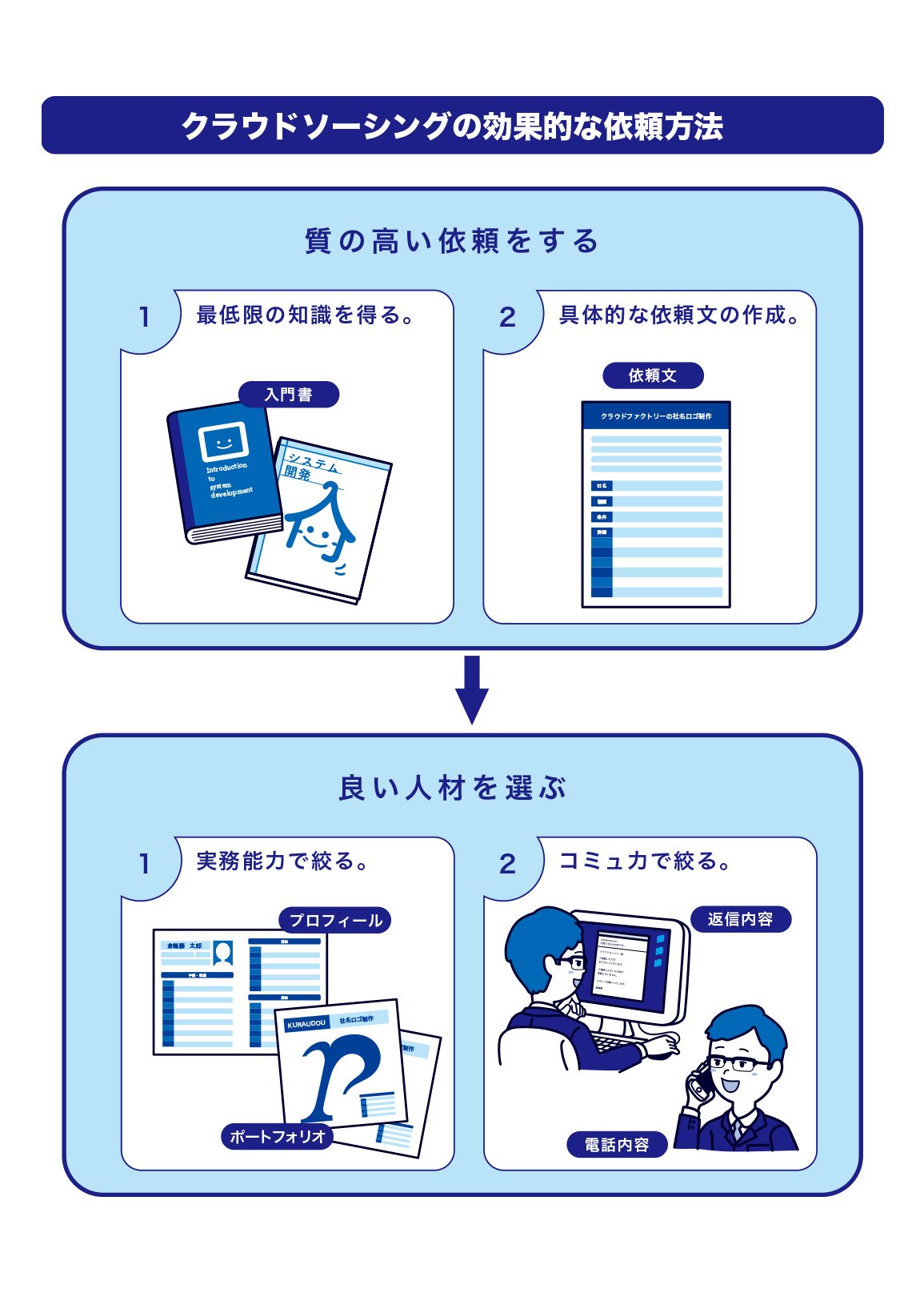 そこで、「システム開発ならシステム開発」「デザインならデザイン」の最低限の知識が必要となります。私はある仕事をクラウドソーシングで依頼する際には「その分野の簡易な本を1冊読む」ようにしています。多くのケースで、それで「質の高い発注することができるレベル」にまで到達することができます。