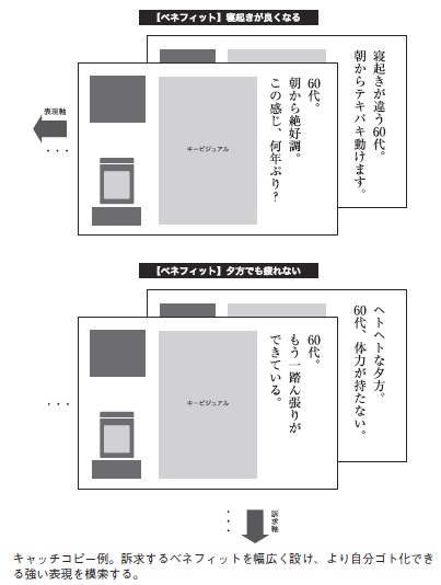 もしスペックが唯一無二であれば、それ自体の訴求でレスポンスの獲得は期待できますが、大半は競合が多い製品かと思います。その際は、前述の潜在層へ向けたインサイト型を意識しながら、その製品のベネフィットを掘り出し、一方的なコミュニケーションにならない表現を心がけましょう。上の図は、活力をサポートする健康食品を仮定したキャッチコピー例となります。「何を言うか」「どう言うか」を整理しながら、まずは数を出すことが重要です