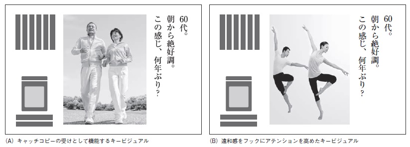 また、広告の第一印象を与えるキービジュアルも、キャッチコピー同様に労力を費やすべき要素です。選択の仕方としては、伝えたいメッセージであるキャッチコピーの受けとして、訴求のスピードをあげるものがベターです。さらに、潜在層を狙うインサイト型クリエイティブでは、キャッチコピーと関連性のないイメージを用い、違和感を抱かせて目を引かせる手法が有効です。先のキャッチコピーを例に、2つのビジュアル例を挙げますので、ぜひ制作の参考になさってください。