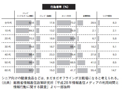 総務省『情報通信メディアの利用時間と情報行動に関する調査』では、年代別に詳しく各メディアの接触状況が集計されています。このレポートでは、web メディアの台頭が一番に見受けられ、特に10 代・20代ではネット利用が進み、反面マスメディア離れが顕著に起こっている状況がわかるかと思います。しかし、60代以上では状況は異なり、テレビ視聴が多いことはもとより、新聞を購読している人がネット利用を上回っているのです。