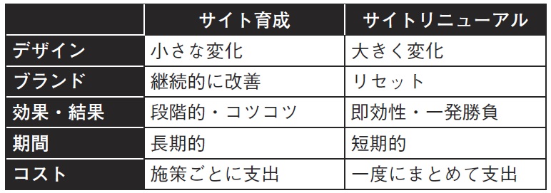 また、サイトリニューアルではサイトデザインも大きく変化することが多いため、ともすれば従来までに築いてきたブランド力がリセットされがちな点も見逃せません。その他にも、期間やコストの面などでも両者にはさまざまな違いがあり、それぞれがメリットにもデメリットにもなりえます。