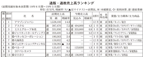 トップとなったアマゾンジャパンは昨年と同様に2桁増(14・3%増)になった。売上高は1兆5281億円。2位は3874億7000万円のアスクルで、今期は4000億円台到達を見通している。3位にはアスクル同様に3000億円台のミスミグループ本社がランクインした。