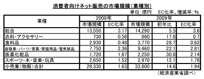 同調査は、次世代電子商取引推進協議会(ECOM)の協力を得て、昨年11月から今年2月に実施。事業者を対象にしたヒアリングや消費者へのアンケート、文献調査などからまとめた。調査対象期間は09年1月~12月。