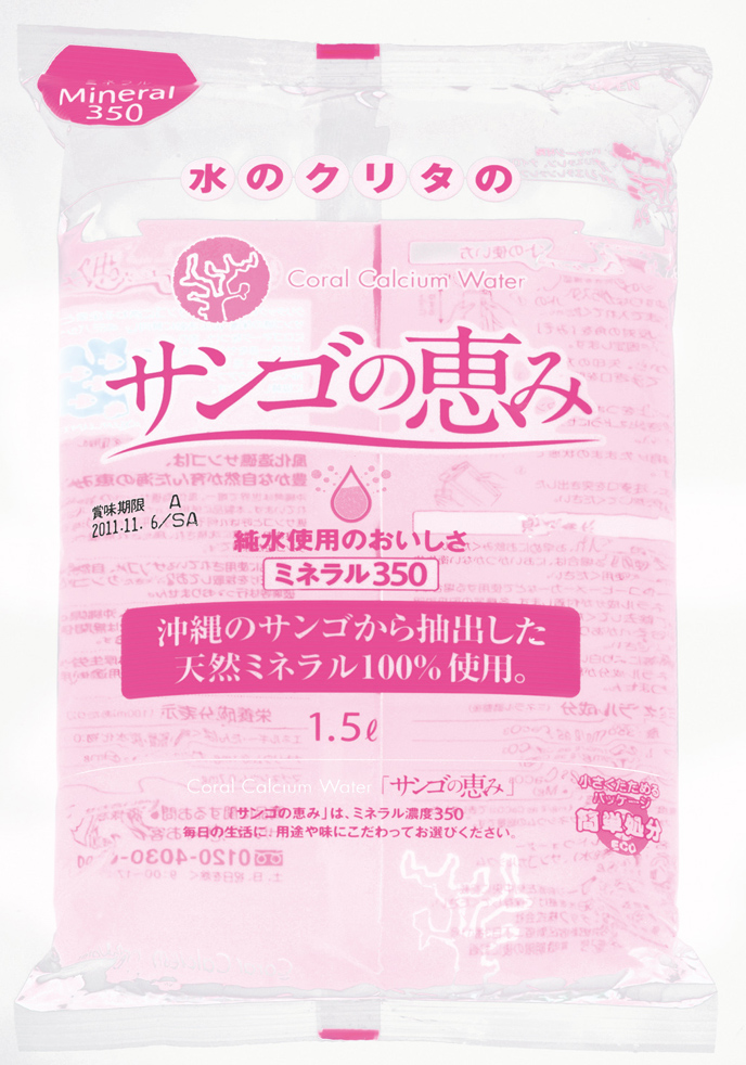 「サンゴの恵み」(写真)は、純水で抽出したサンゴミネラル100%のミネラルウォーターで、硬度350の硬水。沖縄県で採取された風化造礁サンゴ(波の浸食で砂状になったサンゴ)を原料とし、カルシウムを主としたミネラル成分を含む。通常の硬水はマグネシウムが多くカルシウムが少ないが、同商品は逆にカルシウムが多くマグネシウムが少ないため、苦味がなく飲みやすい味になっているという。