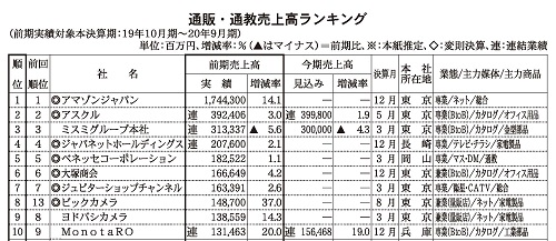 通販新聞社が7月に行った「第74回通販・通教売上高ランキング調査」は、上位300社の合計売上高が前回調査比4・5%増の7兆9351億円だった。市場は、引き続き成長を果たしたものの、大手プラットフォーマーが席巻。寡占化が進む。新型コロナウイルス感染症の影響が長期化する可能性もあり、先行き不透明感も漂う。(※表は週刊通販新聞本紙で掲載した1~300位までの売上高ランキングの中から上位10位のみを掲載)