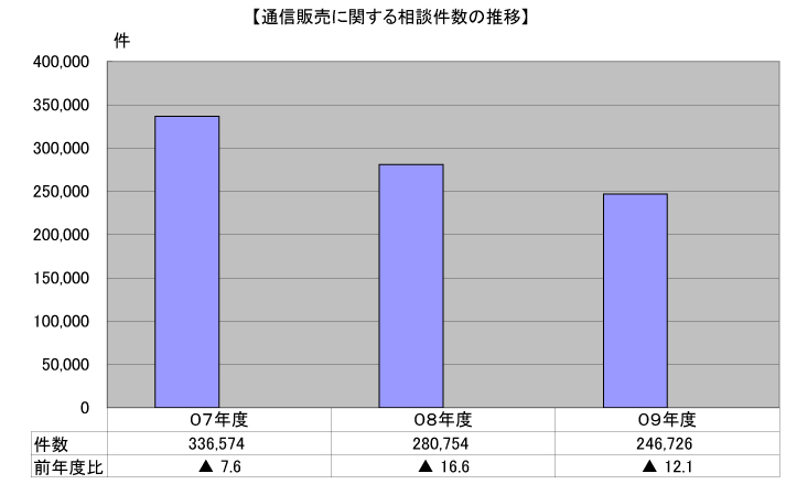 国民生活センターがまとめた、09年度の「通販」の物販に関する相談件数は約6万2000件となった。前年と比べてほぼ横ばいとなったが、07年度の7万6000件と比べると相談件数の下げ止まりがみられた。内容別にみると商品の安全性や品質に関する相談や、返品や返金などの顧客対応に関する相談が増加傾向にある。