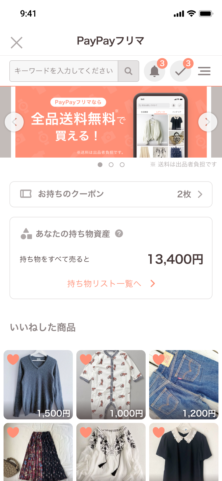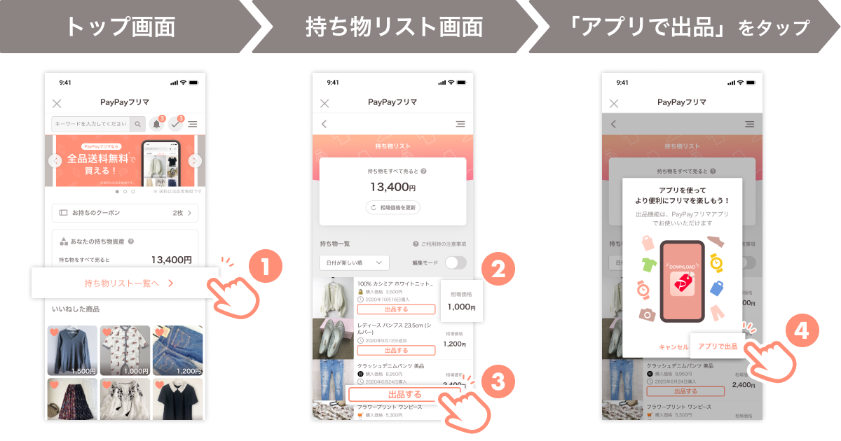 対象商品の相場価格合計は「あなたの持ち物資産」として表示。なお、表示される金額はヤフーが運営するネット競売サイト「ヤフオク!」および「PayPayフリマ」内で行われた過去の取引から算出された当該商品の推定価格となる。「あなたの持ち物資産」の下の「持ち物リスト一覧へ」をタップすると「持ち物リスト」に遷移。対象商品が複数ある場合には商品ごとに相場価格が表示され、「出品ボタン」をタップすると「PayPayフリマ」アプリ内出品フォームへ遷移、出品できるもの。出品価格は提示された相場価格が記載されるが、出品価格は変更できる。