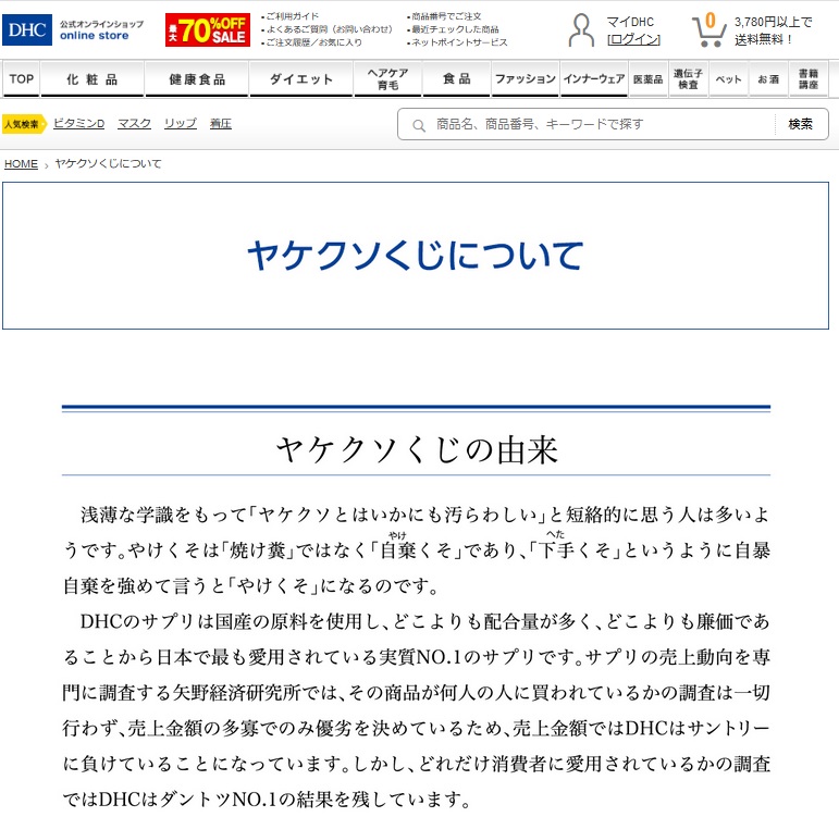 ディーエイチシー(=DHC)が、「ヤケクソくじ」を開始した。愛用されているサプリメントナンバーワンを自任するものの、その思いが消費者に伝わらない吉田会長の苛立ちがネーミングの由来。開始を告知した自社サイト(=画像)では、他社や一部消費者に対する批判も展開している。