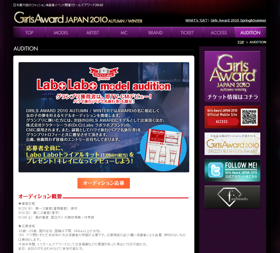 ドクターシーラボが開催するのは「ラボラボモデルオーディション」。人気ファッションイベント「ガールズアワード」との共催という形で、8月上旬から国内在住(国籍不問)で身長160センチ以上の15~25歳の女性を対象に「ガールズアワード」のサイト(=画像)やファッション誌などを通じて告知。希望者は必要な書類を郵送、または専用サイトなどで申し込むと、1次審査(書類審査)、2次審査(面接など)を経て、9月18日に開催される「ガールズアワード2010」で最終審査を実施。グランプリ獲得者(1人を予定)はハワイ旅行(ペア2人旅行券)のほか、ドクターシーラボが今秋以降に放送するテレビCMに出演できる。また、次回の「ガールズアワード」にモデルとして出演できるなどの特典が得られるという。