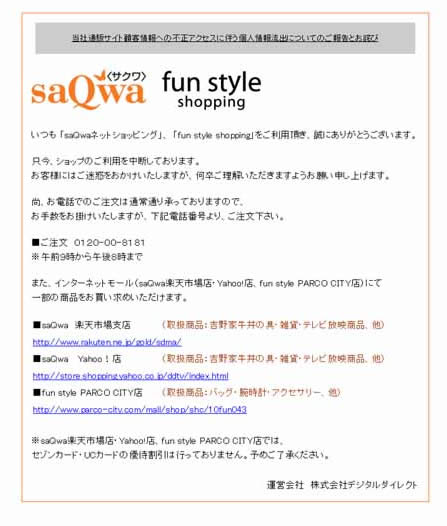 デジタルダイレクトによると個人情報が漏れたのは同社が運営する通販サイト「saQwa(サクワ)ネットショッピング」と「fun style shopping(ファンスタイルショッピング)」の顧客の個人情報。現時点で流出が確認されているのは有効期限切れを含むクレジットカード情報が約5万2,000件、メールアドレス情報は約2万9,000件。このほか、ユーザーIDやログインパスワード、氏名、性別、生年月日、電話番号、住所などが流出した可能性があるという。
