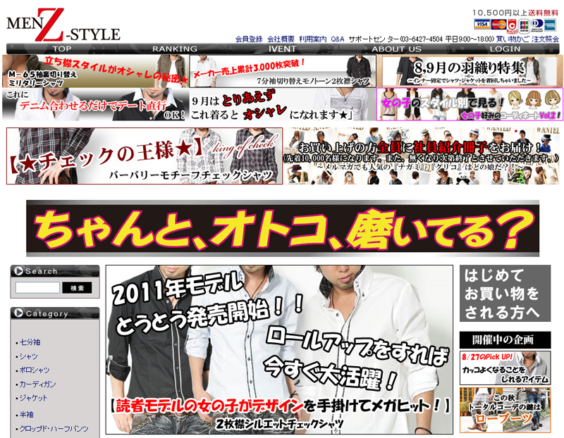 メンズアパレルのネット販売を行う企業の中でも今とりわけ勢いがあるのが、通販サイト「MENZ―STYLE(メンズスタイル)」を運営するメンズスタイル(本社・東京都渋谷区、宇賀神政人社長)。サイトでは約600アイテムの商品を取り扱い、ほとんどが仕入れ商品。主要な顧客層としては学生が4割、26歳までの社会人が4割で、客単価は平均で1万3000円程度と高めだ。