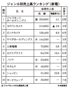 主に家電を販売する小売企業(メーカー直販やパソコン専門は除く)を売上高順に10位まで抜粋した。