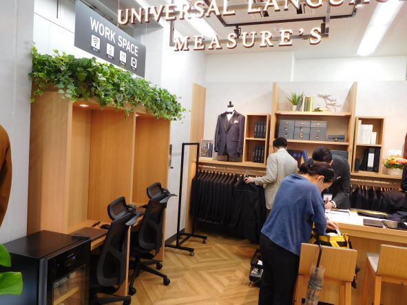 各店舗が立地する地域性などに応じて様々なコンテンツの導入を予定しているもので、 今回の1号店については店内にワークスペースを併設。他県への通勤割合が高い埼玉県にあり、コロナ禍でテレワークの機会も増えたことでワークスペースの需要は高いと見込み、無料で使える空間として提供。コンセントやフリーWiFiも完備しており、ターミナル駅前ならではの出張ビジネスマンの合間時間での利用や、オーダースーツ注文の際の待ち時間などで使われるようなイメージで試験的に展開する。