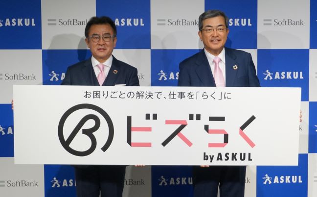 画像はソフトバンクと組んでSaaS・通信商品を中小企業に提案・販売するアスクルの吉岡社長(左)とソフトバンクの今井康之副社長)。