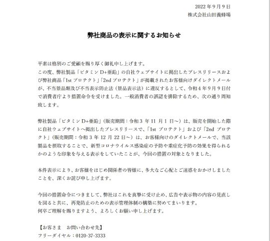 山田養蜂場は、消費者庁の求めに応じ、根拠資料を提出している。処分対象になった「1stプロテクト」等に含まれるプロポリスエキスについて、飲用した新型コロナ患者の入院日数が約3日減少したとするものや、PCR検査陽性者が陰性者に比べ、血中のビタミンD濃度や亜鉛濃度が低かったとするもの、ローヤルゼリーが免疫機能を活性化するというものだ。いずれも可能性だが、商品情報とともに顧客向けDMで紹介されている。薬機法にも抵触する可能性がある。