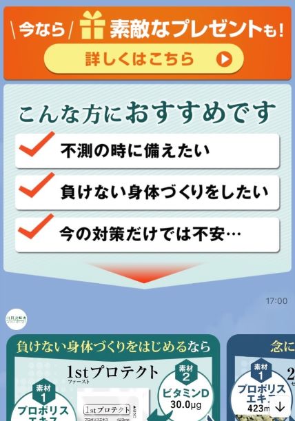 「1stプロテクト」「2ndプロテクト」について、違反の指摘を受けていないLINE広告(=画像)では、「負けない身体づくりに!」、「万全の対策ができる」など具体性のない文言が並ぶ。