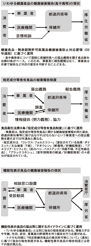 健食の健康被害情報の報告は、海外のダイエット食品の健康被害問題を受け、02年に発出した「健康食品・無承認無許可医薬品健康被害防止対応要領について」(以下、対応要領)がベース。ただ、行政の対応、医師の報告義務を示すもので、事業者は任意に報告など対応の要否を判断する体制にとどまる。