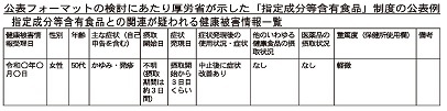成分・製品名を公表しない方針のため、同一製品ごとに「製品1」「製品2」などと記載することを想定している。また、因果関係の評価は、「強く疑われる」「―否定できない」、「おそらくない」、「情報不足で判断不可」の4段階を例示する。
