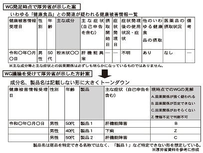 健食には、医薬品や化粧品の被害対応などを行う医薬品医療機器総合機構(PMDA)のような組織はなく、事業者からも任意の報告にとどまる点は課題もある。ただ、WGの検討を受けて厚労省が示した公表フォーマットは、被害情報の適切な把握にはほど遠い。