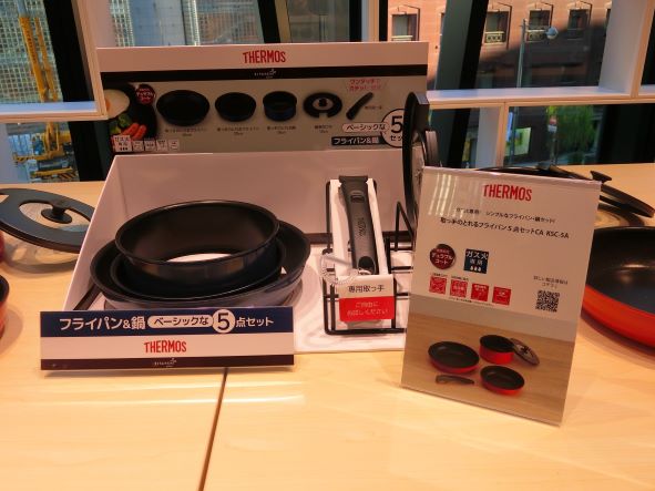 同社初のショールーミングストア「Touch! THERMOS Kitchen Store(タッチ!サーモス キッチンストア)」は、調理器具などのアイテムが150点を突破したことを記念して開設したもので、会場では真空保温調理器シャトルシェフや真空断熱スープジャー、フライパンなど約100点を展示した。